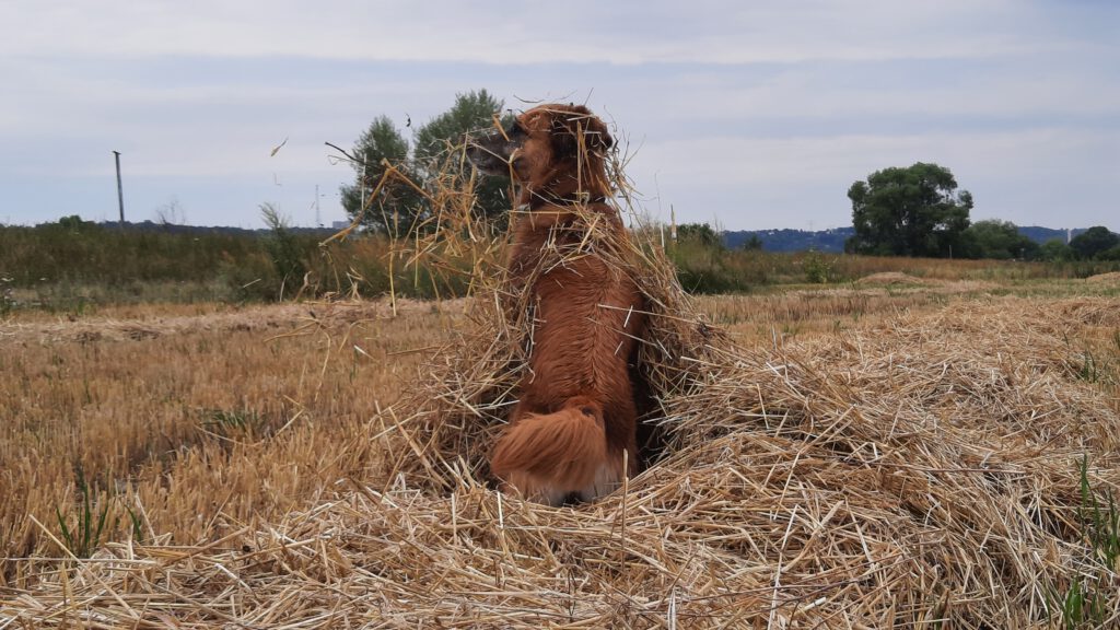 Es sah nicht gut aus für den Hund. Kein Medikament schien zu helfen, es ging immer weiter bergab, bis er nur noch auf der Seite lag und man das Schlimmste befürchtete. Und doch hat er sich wieder aufgerappelt, der modernen Tiermedizin sei Dank. Schritt für Schritt wurde es besser und er hat neuen Spaß am Leben. Früh macht er Yoga und ruft „Huuuuu!“ bis alle es gehört haben. Er kann die Treppe wieder runter steigen und eine kleine Runde laufen, er kann schwimmen, Mäuse ausbuddeln, Stöcke nach Hause tragen, betteln, fressen und schlafen. Wir sind überglücklich.